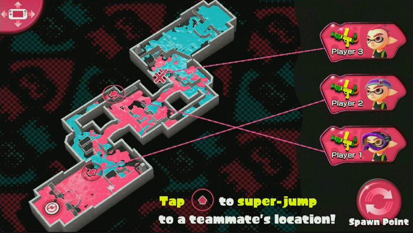 The interplay between human and squid form takes place adds fluidity to the gameplay. Alternate between shooting the ground ahead with ink in human form, and switching to Squid to swim ahead quickly. Or swim-strafe as a squid to avoid enemy fire, popping up in human form to take well timed shots for the kill. Using weapons drains the ink canister on your back, forcing you to switch and swim in squid mode to refill it. The key is that squid form only works while in your own coloured ink. Standing in enemy ink will grind your movement to a near-halt, making for easy pickings. If you are hit and killed by enemy ink, you re-spawn back at your home base after a very brief cool down. From your home base you can use the GamePad to tap on one of your own players and perform a super jump that launches you directly to their location. Once the timer is up, the match is over and the results are tallied. The team with the most ground covered in their own ink wins the match. Experience points for levelling your character and money for purchasing weapons and gear are awarded, with a bonus amount going to the winning team.